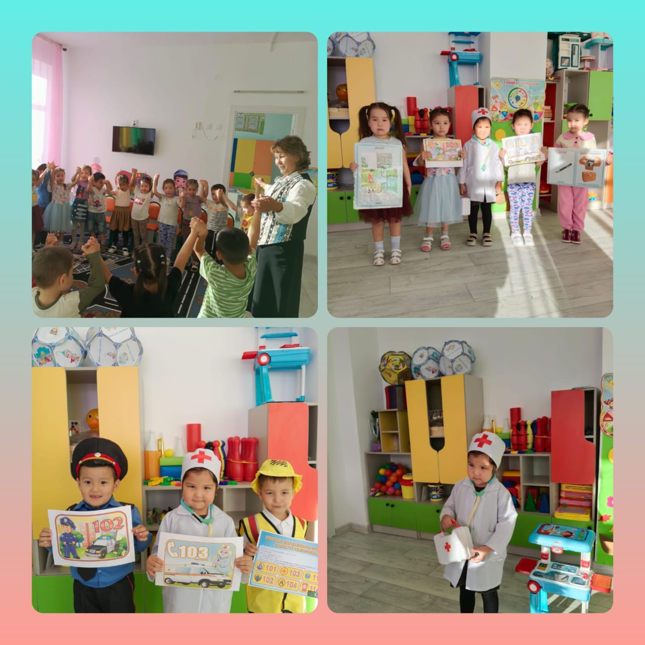 Міндеті: Балаларды жедел қызметтердің байланыс орталықтарының телефон номерлерін есте сақтауды " 101,102,103" қажет кезде дұрыс қолдануды үйрету.Өрт сөндірушілер,полиция қызметкерлері,медициналық қызметкер мамандықтарын ажыратып,рөлдік ойындарды сомдау дағдыларын қалыптастыру.