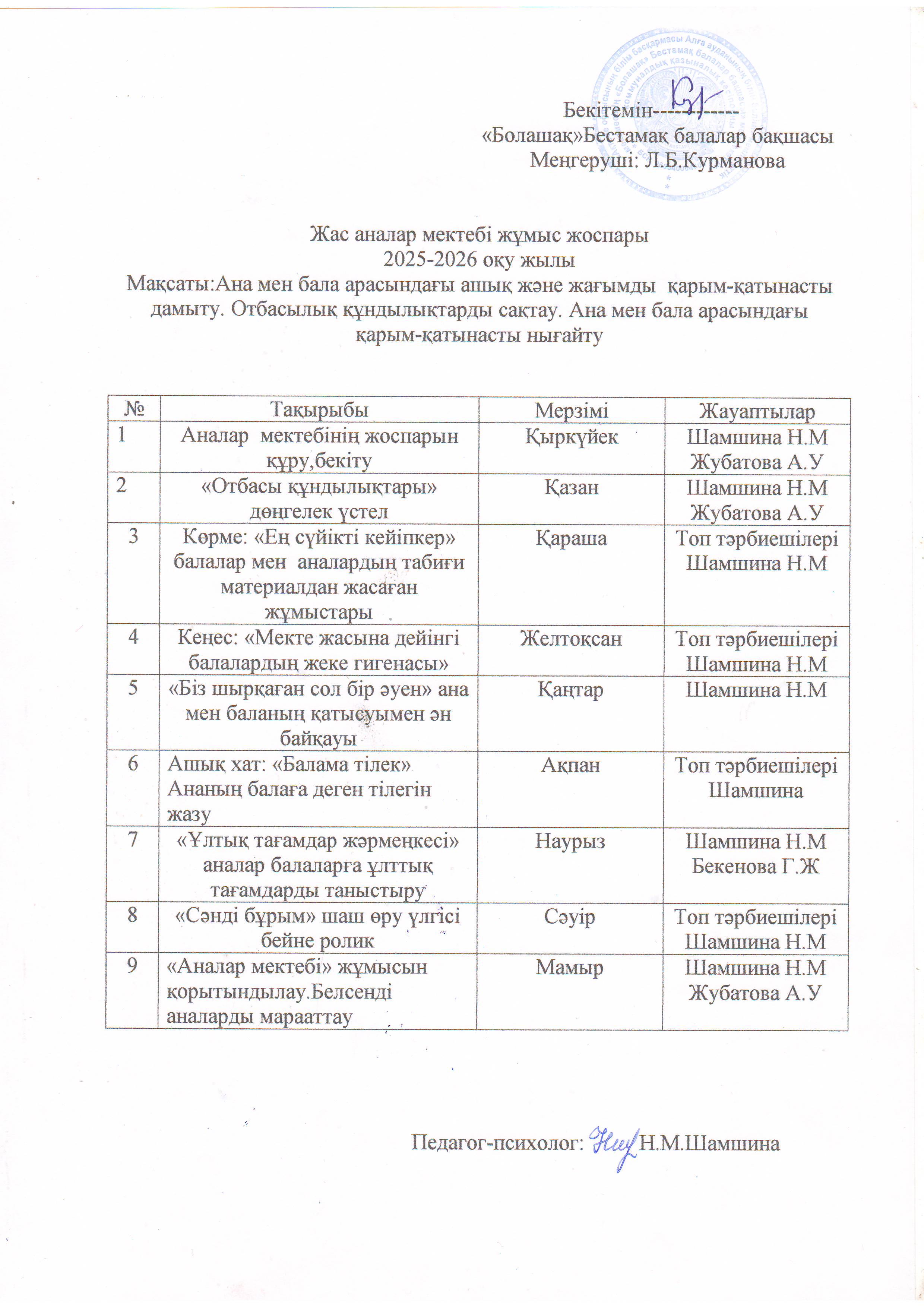 | 1 | Жас аналар мектебінің жұмыс жоспары 2024 - 2025 |